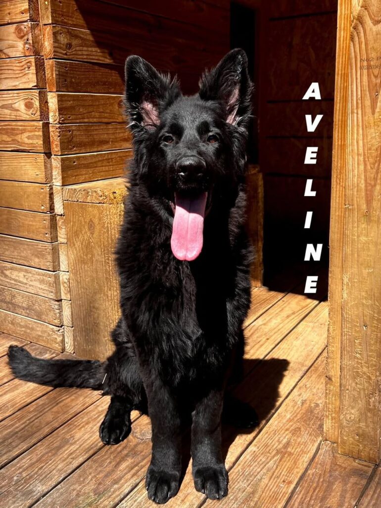 - Miss. Aveline is a charming and beautiful long coat German Shepherd puppy from our "AA" litter, and she is ready to find her forever home. Her stunning all-black coat is thick and luxurious, giving her a teddy bear-like quality. With her bright eyes and big, happy smile, Aveline is a picture of joy and youthful energy. At 5.5 months old, she is at the perfect age for training and socialization, making her a great fit for a family committed to providing her with love and guidance. Aveline has a playful and affectionate spirit and is sure to grow into a loyal and loving companion. She is ready to fill a home with endless fun and devotion.