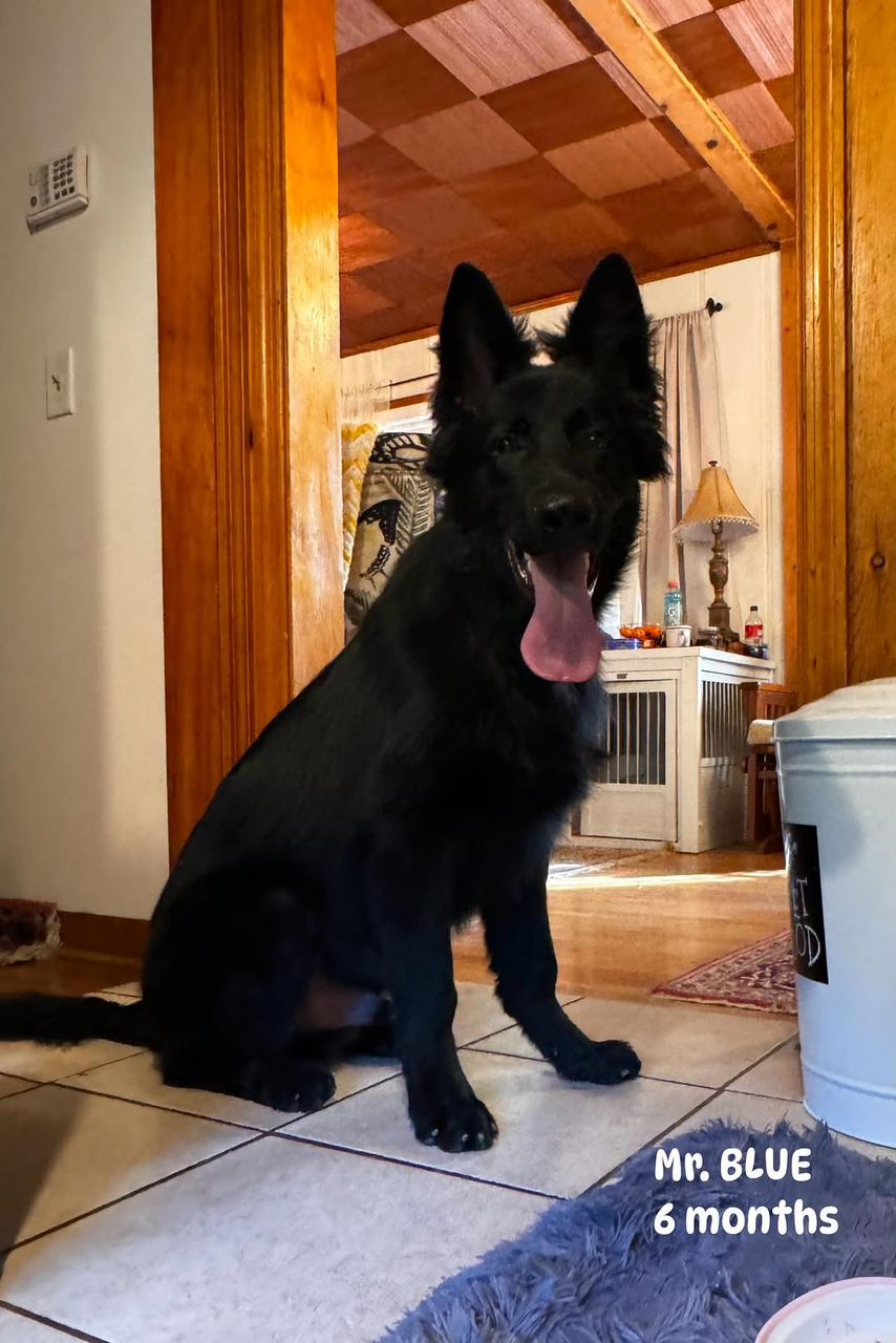 - Mr. Blue is a promising young sire in our program. At just 6 months old, his stunning solid black long coat and cheerful, attentive expression show a puppy with a wonderful and confident temperament. Pictured indoors, he appears calm and at ease, which speaks to his balanced nature. Mr. Blue has a luxurious coat and a strong build that are clear indicators of excellent genetic traits. We are confident he will continue to develop into a superb sire who will contribute his exceptional health and personality to his future progeny.