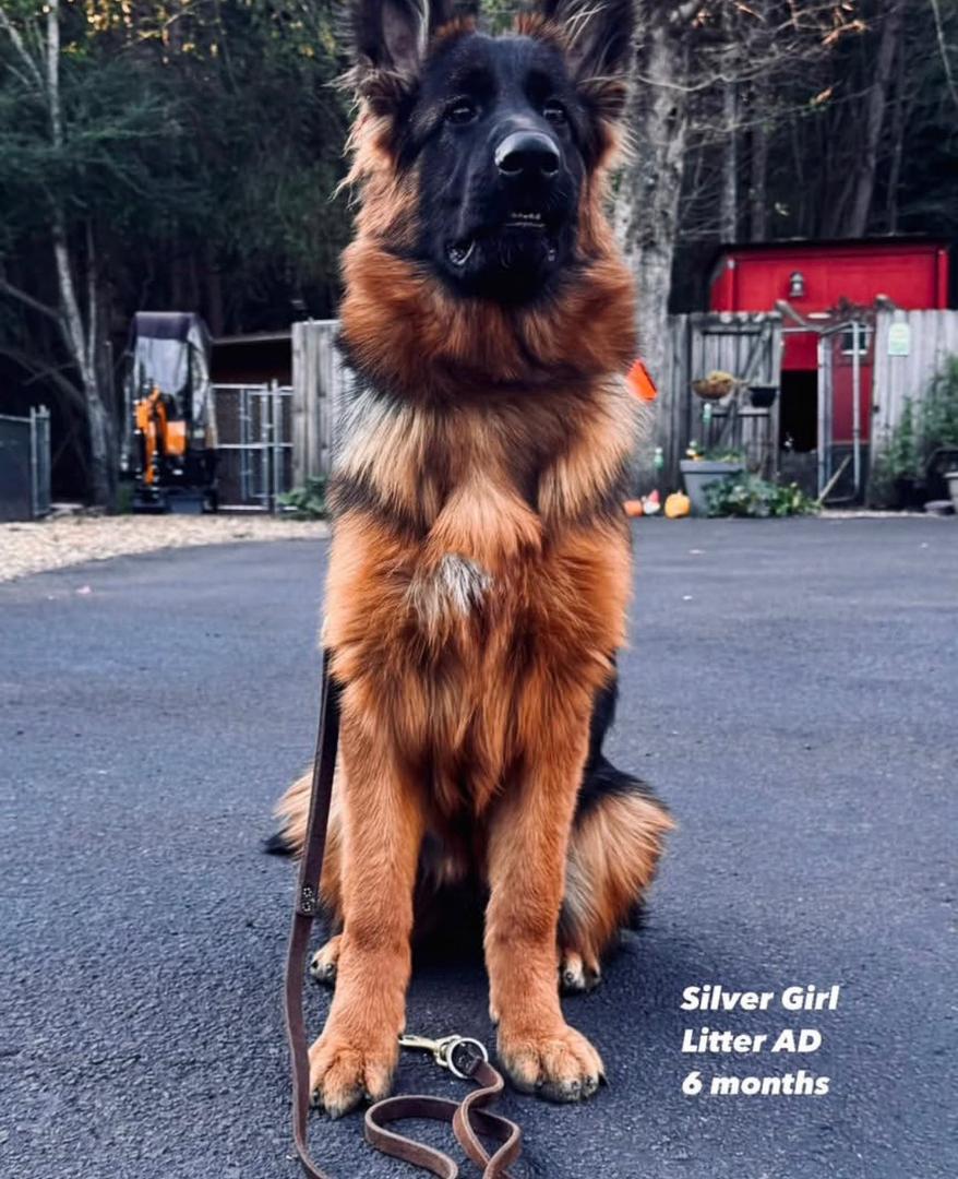 - Silver Girl from our Litter AD is a beautiful long coat German Shepherd puppy who is ready for her forever home. At just 6 months old, she has a striking coat with rich red and black markings, and her fluffy fur gives her a sweet and gentle appearance. Pictured sitting calmly, Silver Girl shows her intelligent and composed nature. She is at the perfect age for training and will thrive with a loving family committed to her growth and socialization. She is a loyal and devoted puppy with a bright future ahead of her. She is sure to become a wonderful and cherished companion.