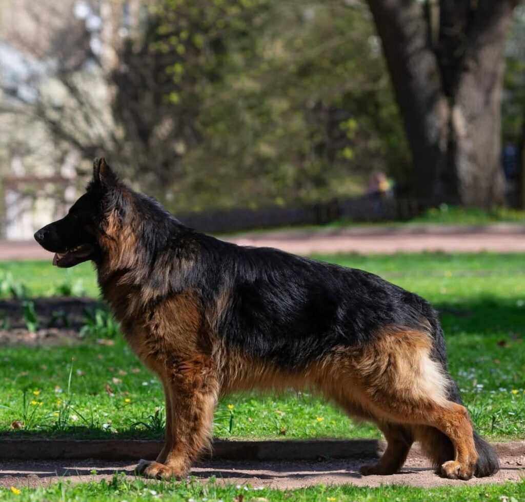 - Max is a superb long coat German Shepherd and an exceptional sire for our breeding program. Pictured in a classic stance, he showcases the breed's ideal conformation with his strong, well-proportioned body and proud posture. His coat is a beautiful blend of deep black and rich tan, flowing luxuriously around his frame. Max's profile highlights his noble head, erect ears, and powerful physique, all of which are key traits we look to pass on to the next generation. His calm yet alert demeanor and excellent structure make him a perfect example of the breed. We are confident that Max will contribute outstanding health, temperament, and looks to his progeny.