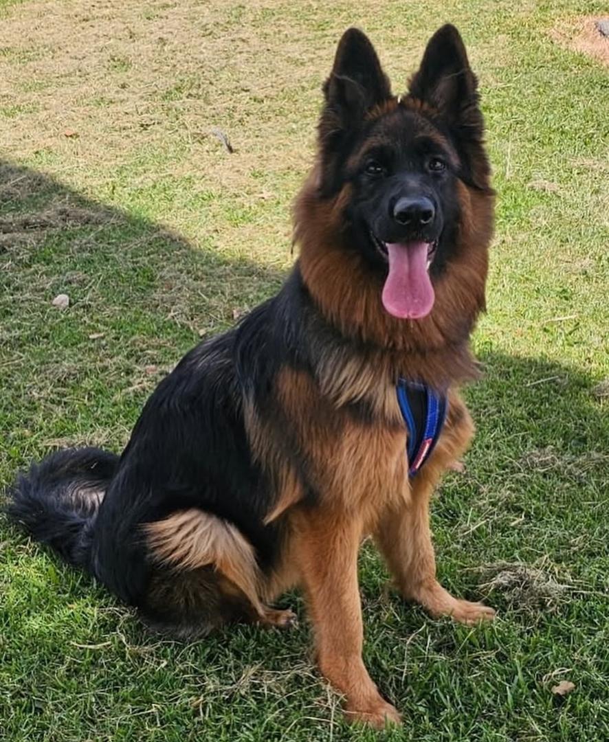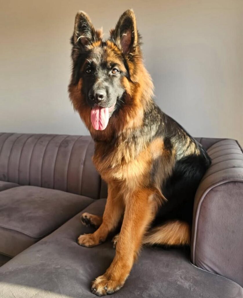 - Angle is a beautiful long coat German Shepherd and an exceptional dam in our breeding program. Pictured relaxed on a couch, she has a confident and gentle expression that showcases her wonderful temperament. Her thick, luxurious coat is a striking mix of deep black and rich tan, highlighting her beautiful features. Her alert, upright ears and friendly, open-mouthed expression show a happy and intelligent dog who is comfortable and at ease. Angle's excellent conformation and sweet disposition make her an ideal mother, and we expect her to produce outstanding puppies with similar qualities.