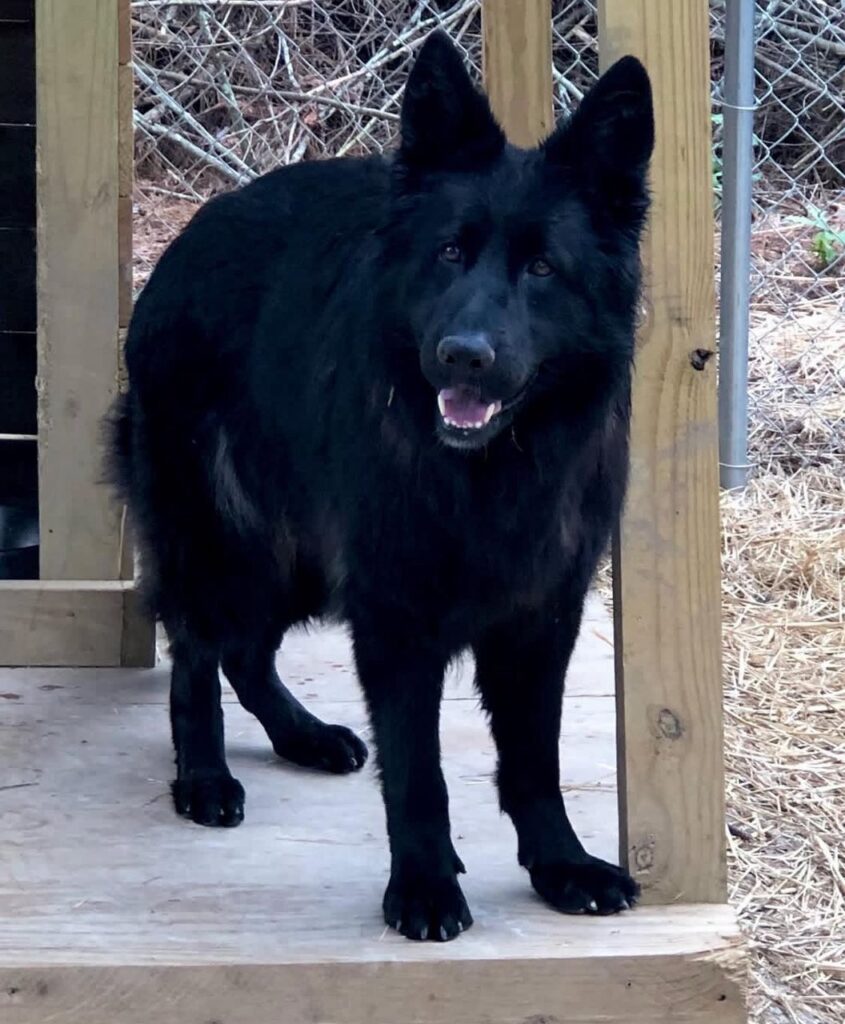 - Nava is a striking solid black German Shepherd and a valued dam in our breeding program. Her luxurious, dense coat gives her a powerful and elegant presence, perfectly framing her noble head and intelligent, warm eyes. Pictured standing confidently, Nava's excellent conformation and strong, balanced physique are evident. Her alert and friendly expression, with a slightly open mouth, hints at her wonderful temperament and keen intelligence. Nava embodies the strength and loyalty characteristic of the breed, and her solid black coloring is truly magnificent. We are confident she will pass on her superb health, exceptional structure, and beautiful looks to her puppies.